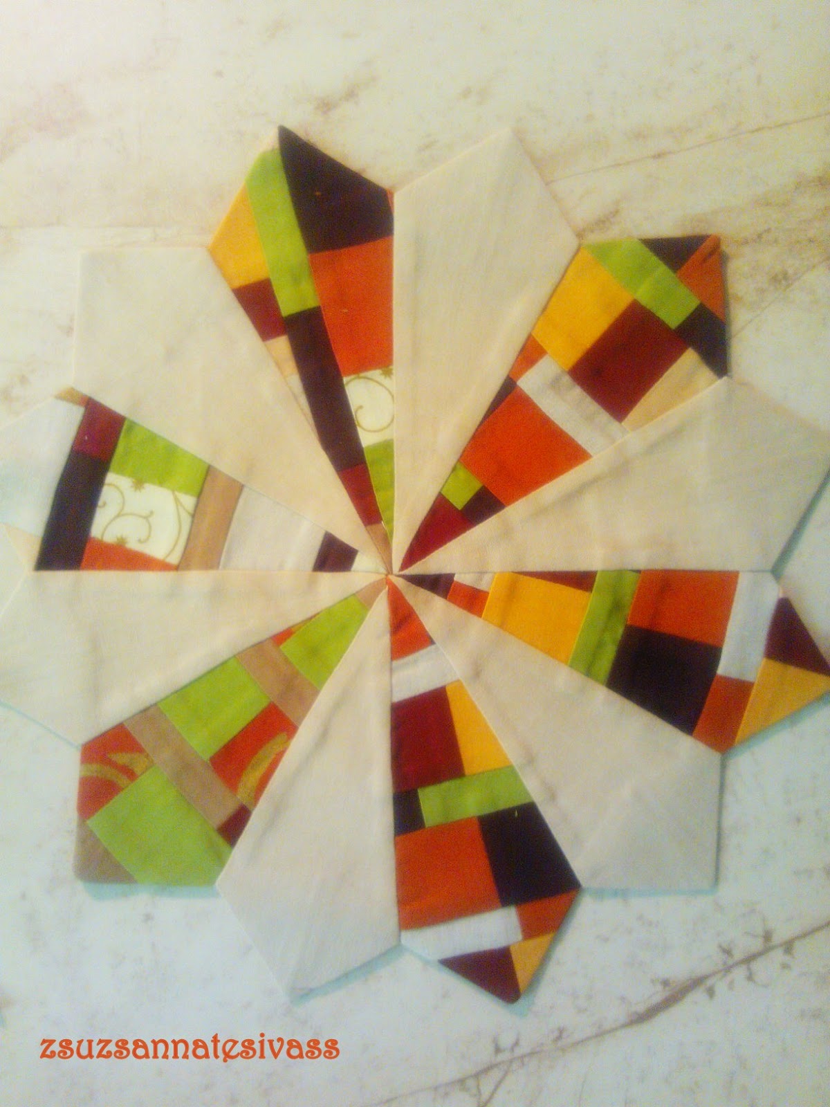Ez a blokk sokkal látványosabb, mint bonyolult, és rengeteg variációt ki lehet találni vele kapcsolatban. Lehet minden szirom más és más, lehet csak két színből, és ha van otthon maradék blokk, azokat is fel lehet használni, mint ahogy a bemutató darabon én is ezt tettem.